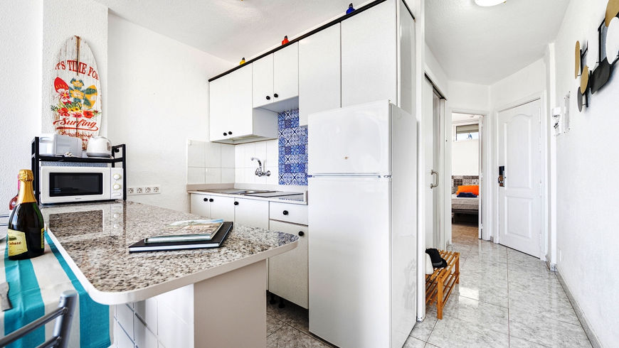 The apartment consists of a big living room with american kitchenette, a spacious private balcony terrace with beautiful views and a double bedroom with large closets. It is fully furnished, equipped, and offers a high speed wifi access. The living room has a 40" flat screen TV with international channels. On the kitchen side, you have a microwave, induction hobs, a refrigerator with doble door, a kettle, a coffee maker, hotplates and all the necessary crockery.